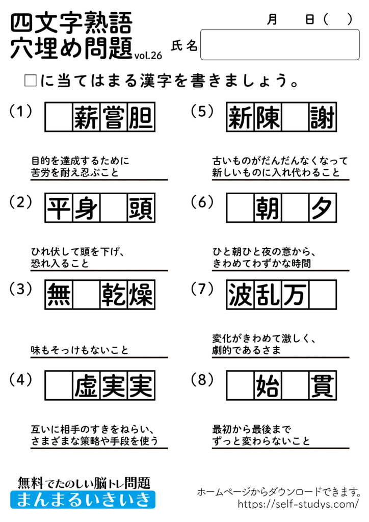 ヒントとして四文字熟語の意味を載せてあります。