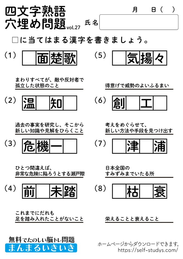 ヒントとして四文字熟語の意味を載せてあります。
