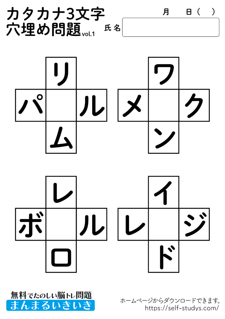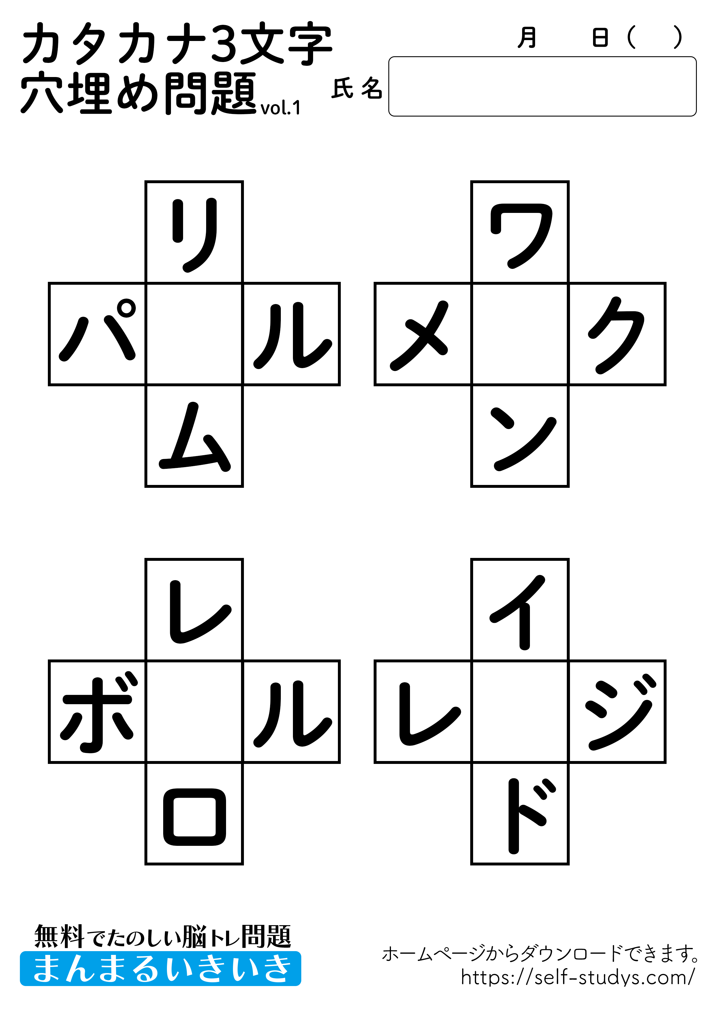 カタカナ穴埋め問題プリント1 2022.09.12 カタカナ穴埋め問題プリント1問題はすべて無料で使えます。下記の画像、もしくは、【問題ダウンロード】をクリックして印刷してご利用ください。 問題ダウンロード答えダウンロード 身近にあるのに、いつも使っていたり、生活していると自然と目にしているカタカナの穴埋め問題。わかっているけど、知っているけど出てこないということがあると思います。ひらがなよりも少し難しいかもしれませんが、たくさんの言葉を思い浮かべて、思考力が向上し脳の活性化につながります。いつまでも健康でいられるお手伝いが出来たら幸せです。