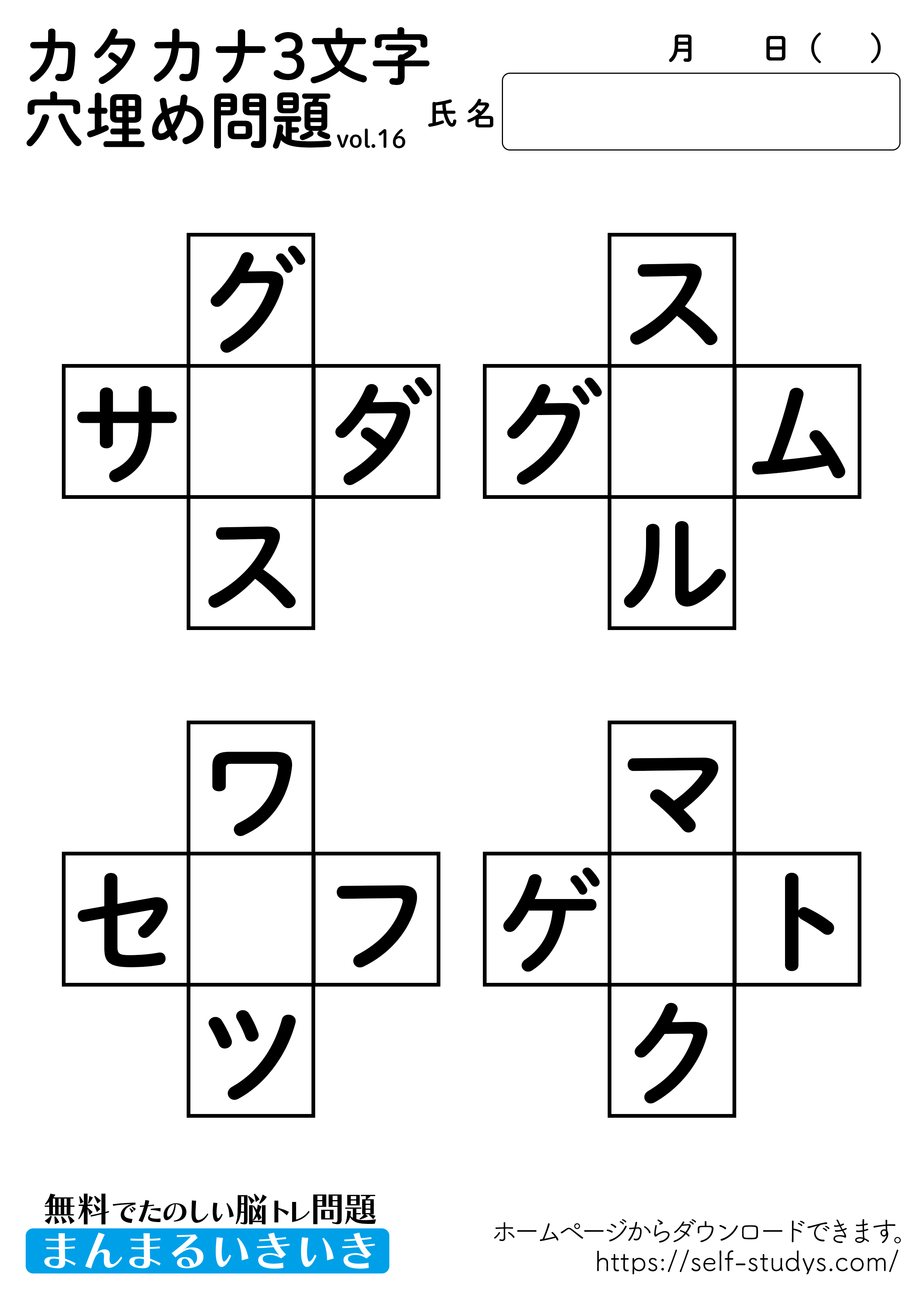 カタカナ穴埋め問題プリント16 2022.09.13 カタカナ穴埋め問題プリント16問題はすべて無料で使えます。下記の画像、もしくは、【問題ダウンロード】をクリックして印刷してご利用ください。 問題ダウンロード答えダウンロード 身近にあるのに、いつも使っていたり、生活していると自然と目にしているカタカナの穴埋め問題。わかっているけど、知っているけど出てこないということがあると思います。ひらがなよりも少し難しいかもしれませんが、たくさんの言葉を思い浮かべて、思考力が向上し脳の活性化につながります。いつまでも健康でいられるお手伝いが出来たら幸せです。