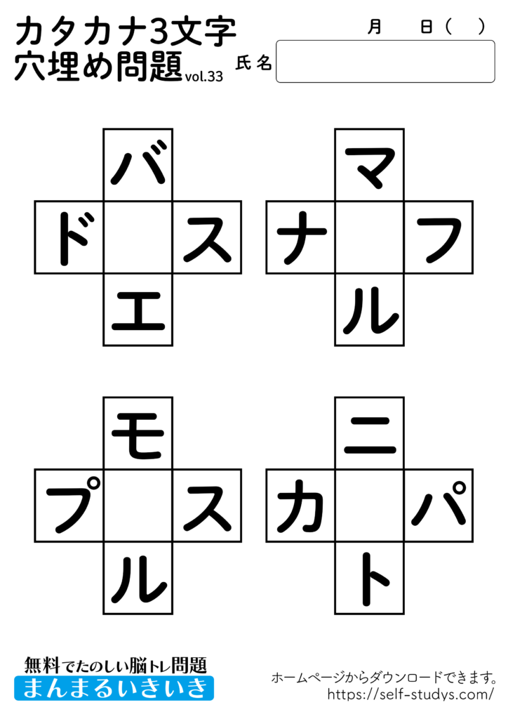 カタカナ穴埋め問題プリント33 2022.09.13 カタカナ穴埋め問題プリント33問題はすべて無料で使えます。下記の画像、もしくは、【問題ダウンロード】をクリックして印刷してご利用ください。 問題ダウンロード答えダウンロード 身近にあるのに、いつも使っていたり、生活していると自然と目にしているカタカナの穴埋め問題。わかっているけど、知っているけど出てこないということがあると思います。ひらがなよりも少し難しいかもしれませんが、たくさんの言葉を思い浮かべて、思考力が向上し脳の活性化につながります。いつまでも健康でいられるお手伝いが出来たら幸せです。