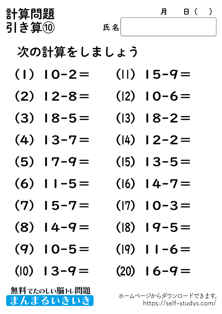 引き算プリント10 2022.07.11 2022.07.05 引き算プリント10問題はすべて無料で使えます。下記の画面、もしくは、【問題ダウンロード】をクリックして印刷してご利用ください。 問題ダウンロード答えダウンロード 簡単な計算問題ですが、頭の中で計算をすることで脳を使うことになるので、脳の活性化につながります。いつまでも健康でいられるお手伝いが出来たら幸せです。
