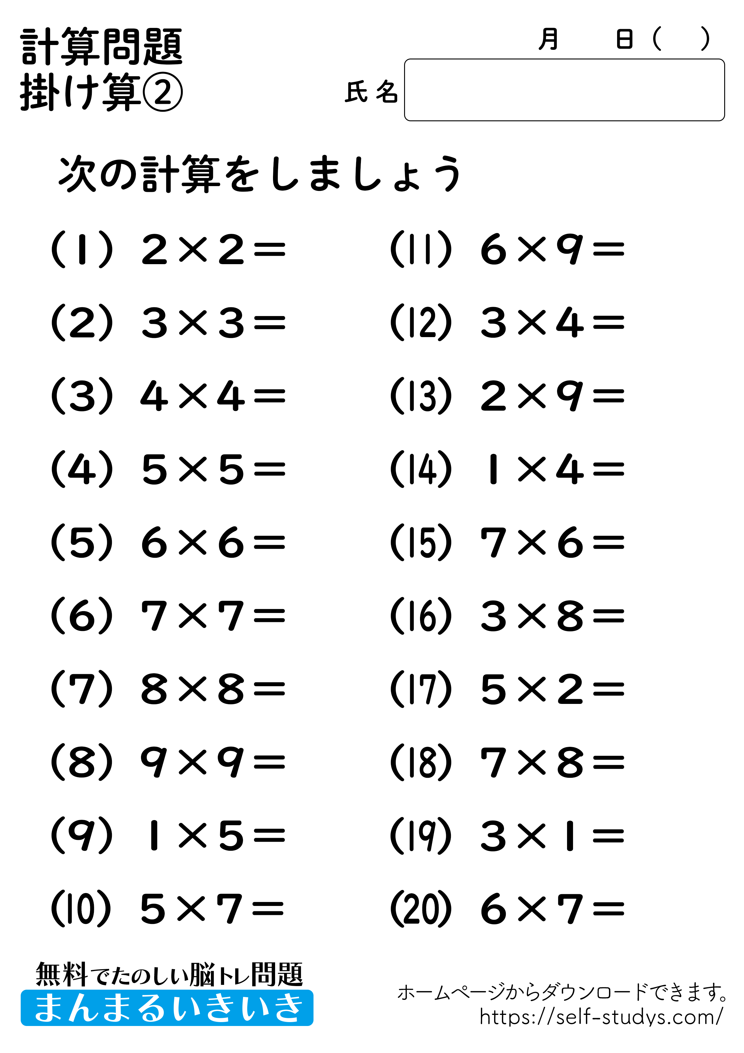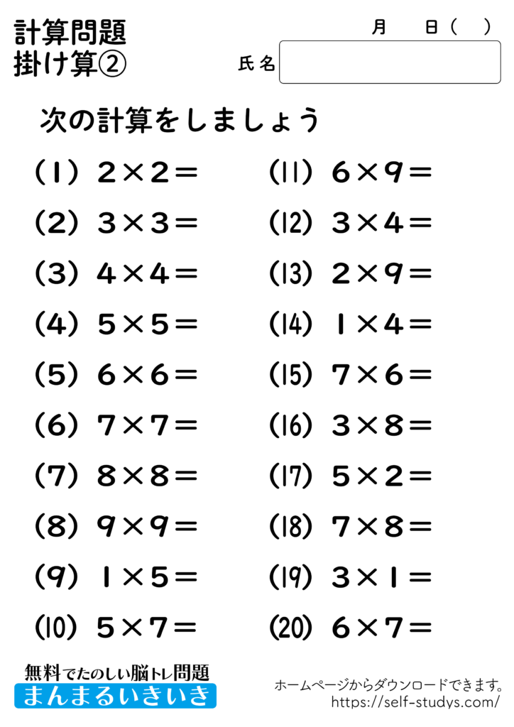 掛け算プリント2 2022.07.11 2022.07.05 掛け算プリント2問題はすべて無料で使えます。下記の画像、もしくは、【問題ダウンロード】をクリックして印刷してご利用ください。 問題ダウンロード答えダウンロード 簡単な計算問題ですが、頭の中で計算をすることで脳を使うことになるので、脳の活性化につながります。いつまでも健康でいられるお手伝いが出来たら幸せです。