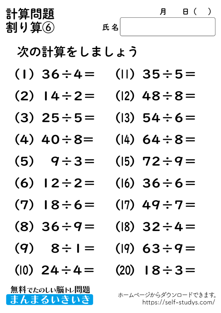 掛け算プリント6 2022.07.11 2022.07.05 掛け算プリント6問題はすべて無料で使えます。下記の画像、もしくは、【問題ダウンロード】をクリックして印刷してご利用ください。 問題ダウンロード答えダウンロード 簡単な計算問題ですが、頭の中で計算をすることで脳を使うことになるので、脳の活性化につながります。いつまでも健康でいられるお手伝いが出来たら幸せです。