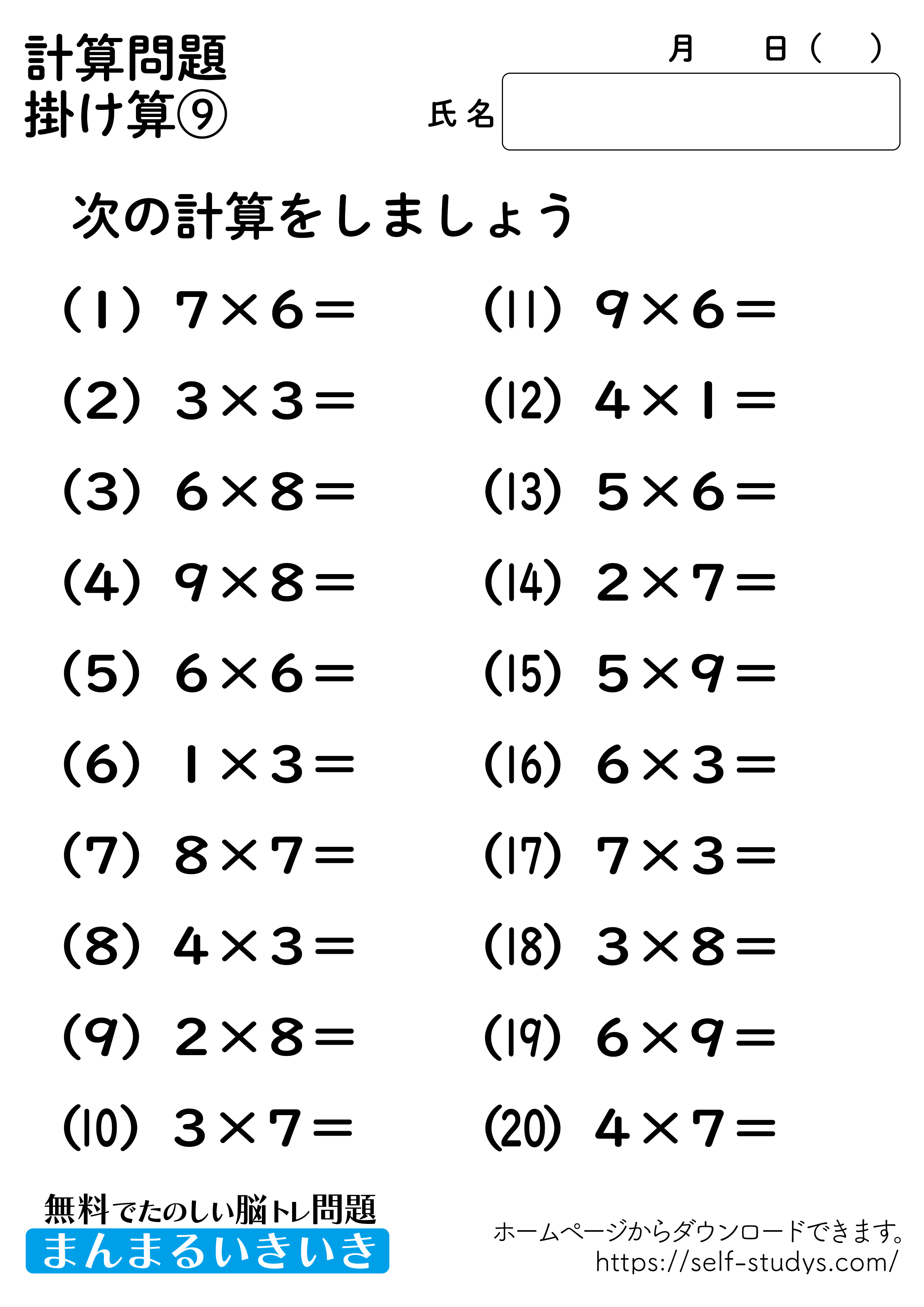 掛け算プリント9 2022.07.11 2022.07.05 掛け算プリント9問題はすべて無料で使えます。下記の画像、もしくは、【問題ダウンロード】をクリックして印刷してご利用ください。 問題ダウンロード答えダウンロード 簡単な計算問題ですが、頭の中で計算をすることで脳を使うことになるので、脳の活性化につながります。いつまでも健康でいられるお手伝いが出来たら幸せです。