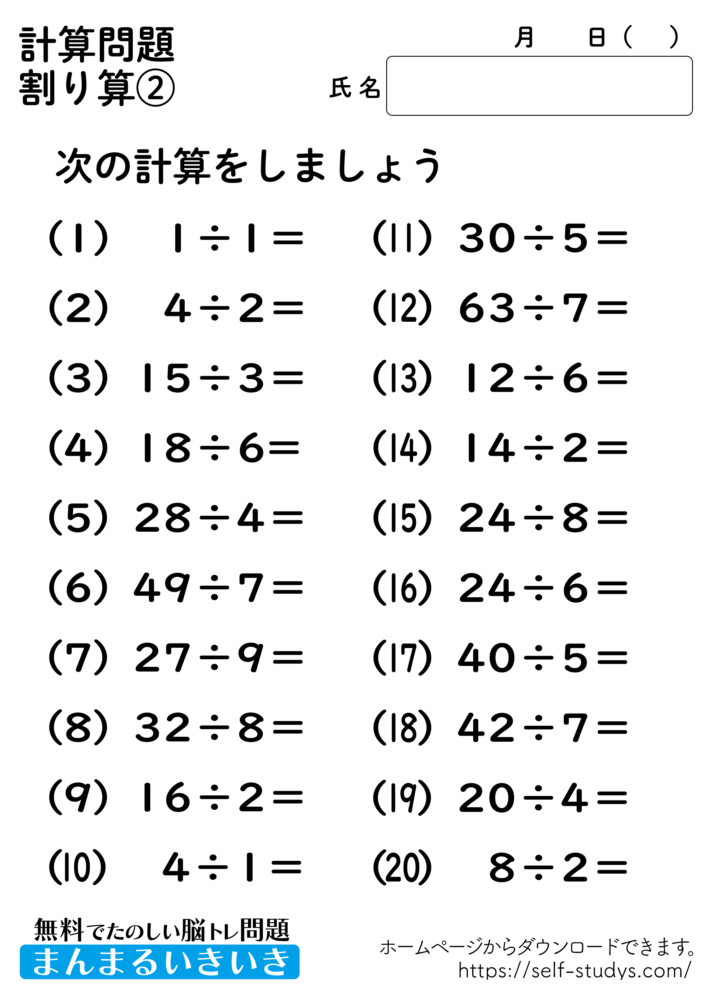 割り算プリント2 2022.07.11 2022.07.05 割り算プリント2問題はすべて無料で使えます。下記の画像、もしくは、【問題ダウンロード】をクリックして印刷してご利用ください。 問題ダウンロード答えダウンロード 簡単な計算問題ですが、頭の中で計算をすることで脳を使うことになるので、脳の活性化につながります。いつまでも健康でいられるお手伝いが出来たら幸せです。