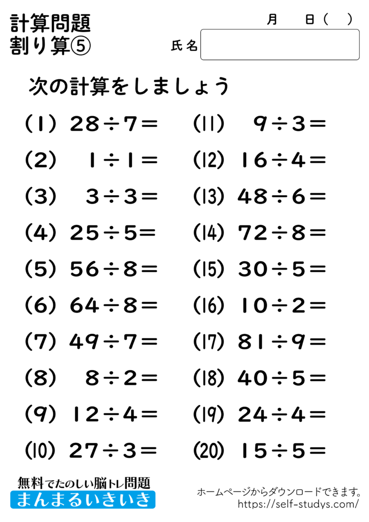 割り算プリント5 2022.07.11 2022.07.05 割り算プリント5問題はすべて無料で使えます。下記の画像、もしくは、【問題ダウンロード】をクリックして印刷してご利用ください。 問題ダウンロード答えダウンロード 簡単な計算問題ですが、頭の中で計算をすることで脳を使うことになるので、脳の活性化につながります。いつまでも健康でいられるお手伝いが出来たら幸せです。