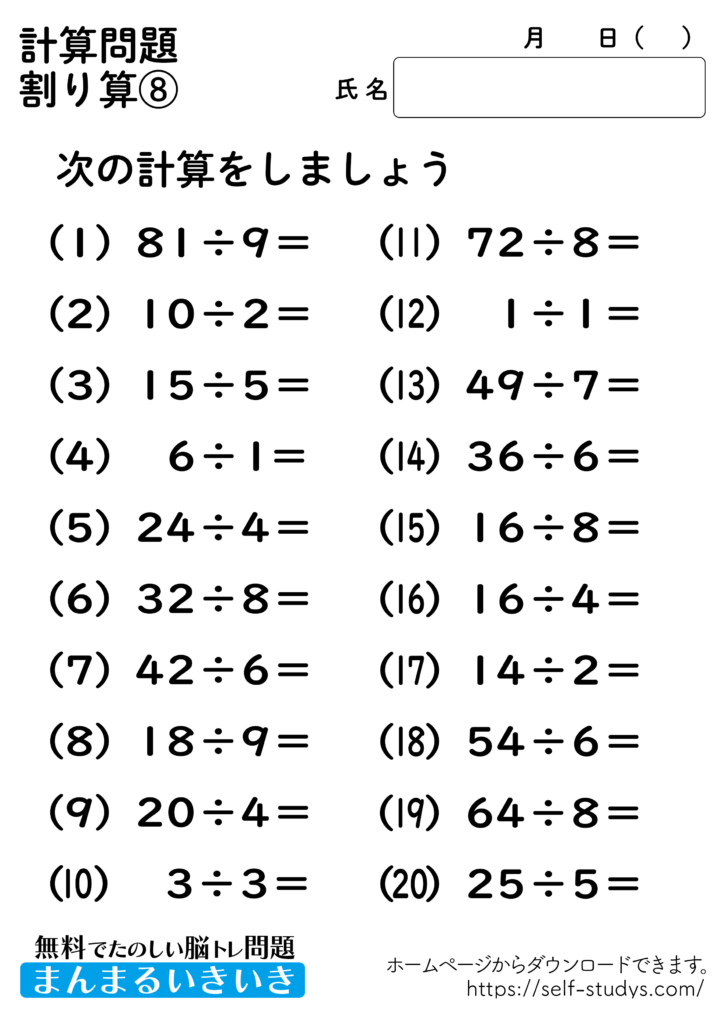 割り算プリント8 2022.07.11 2022.07.05 割り算プリント8問題はすべて無料で使えます。下記の画像、もしくは、【問題ダウンロード】をクリックして印刷してご利用ください。 問題ダウンロード答えダウンロード 簡単な計算問題ですが、頭の中で計算をすることで脳を使うことになるので、脳の活性化につながります。いつまでも健康でいられるお手伝いが出来たら幸せです。