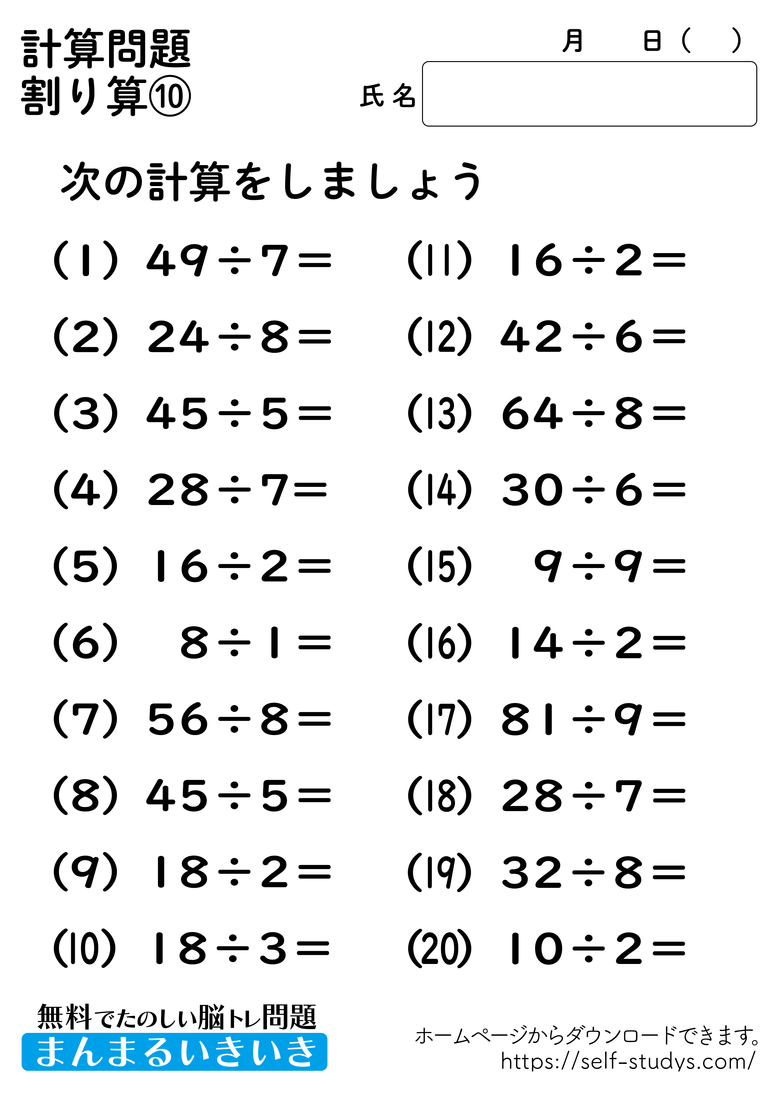 割り算プリント10 2022.07.11 2022.07.05 割り算プリント10問題はすべて無料で使えます。下記の画像、もしくは、【問題ダウンロード】をクリックして印刷してご利用ください。 問題ダウンロード答えダウンロード 簡単な計算問題ですが、頭の中で計算をすることで脳を使うことになるので、脳の活性化につながります。いつまでも健康でいられるお手伝いが出来たら幸せです。