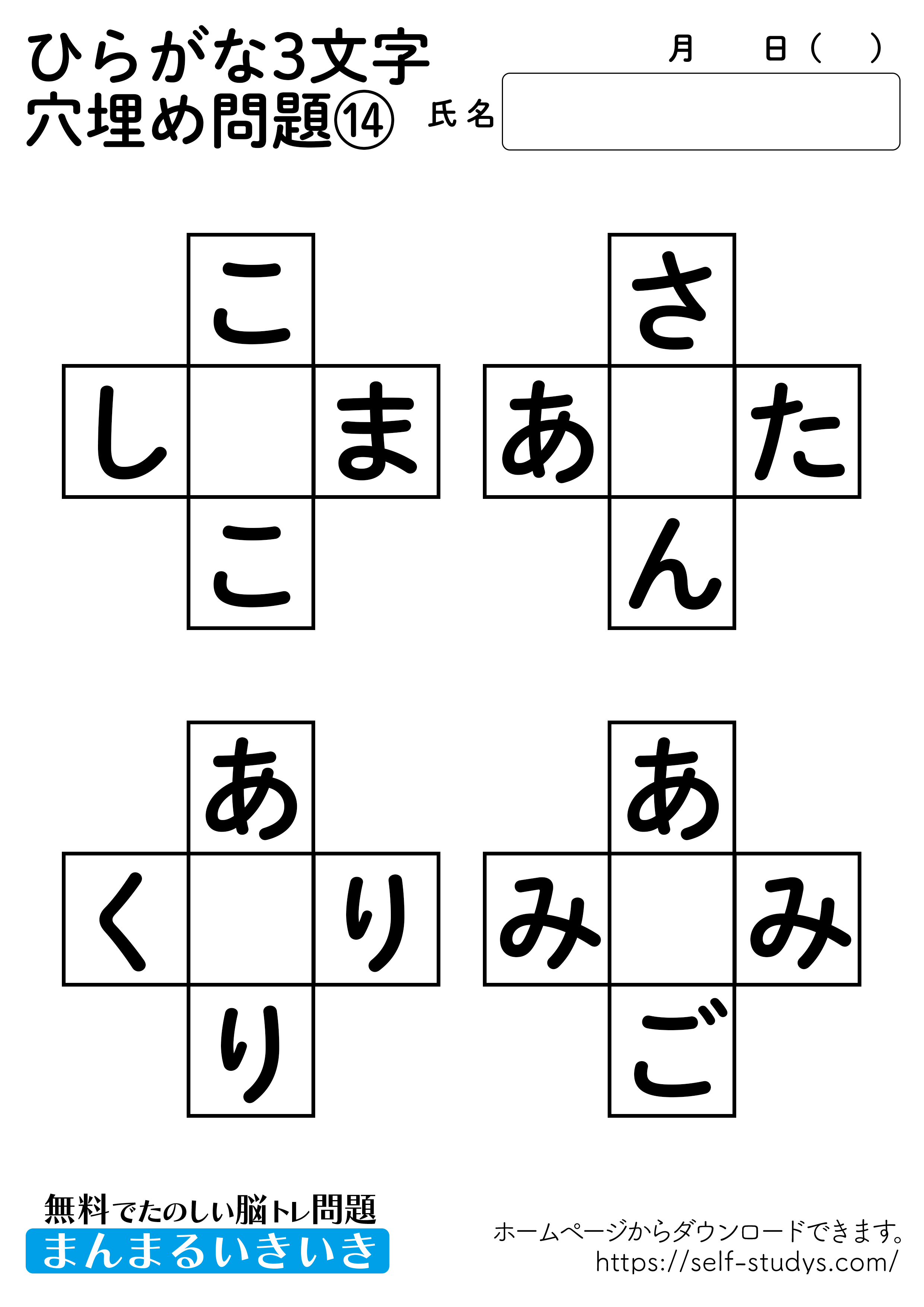 ひらがな穴埋め問題プリント14 2022.07.11 2022.07.05 ひらがな穴埋め問題プリント14問題はすべて無料で使えます。下記の画像、もしくは、【問題ダウンロード】をクリックして印刷してご利用ください。 問題ダウンロード答えダウンロード 意外と出てこないひらがなの問題。あれもこれもとたくさんの単語を頭に浮かべるので、思考力が向上し脳の活性化につながります。いつまでも健康でいられるお手伝いが出来たら幸せです。