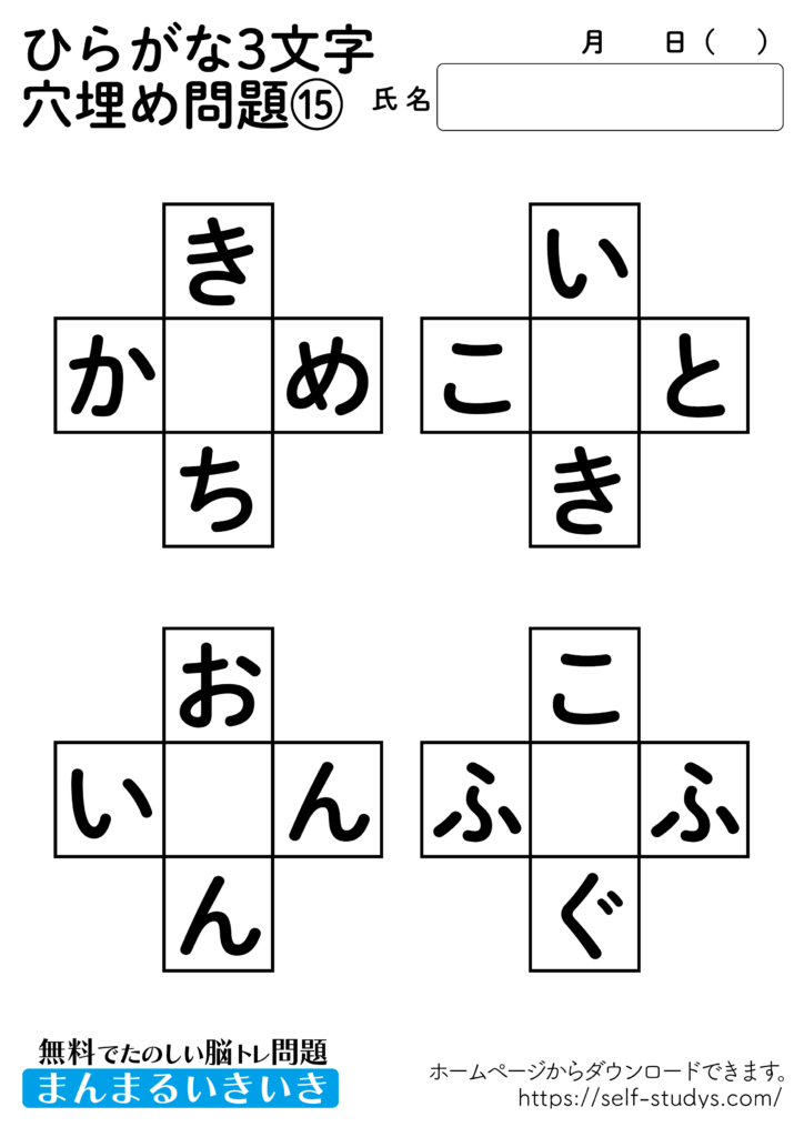 ひらがな穴埋め問題プリント15 2022.07.11 2022.07.05 ひらがな穴埋め問題プリント15問題はすべて無料で使えます。下記の画像、もしくは、【問題ダウンロード】をクリックして印刷してご利用ください。 問題ダウンロード答えダウンロード 意外と出てこないひらがなの問題。あれもこれもとたくさんの単語を頭に浮かべるので、思考力が向上し脳の活性化につながります。いつまでも健康でいられるお手伝いが出来たら幸せです。