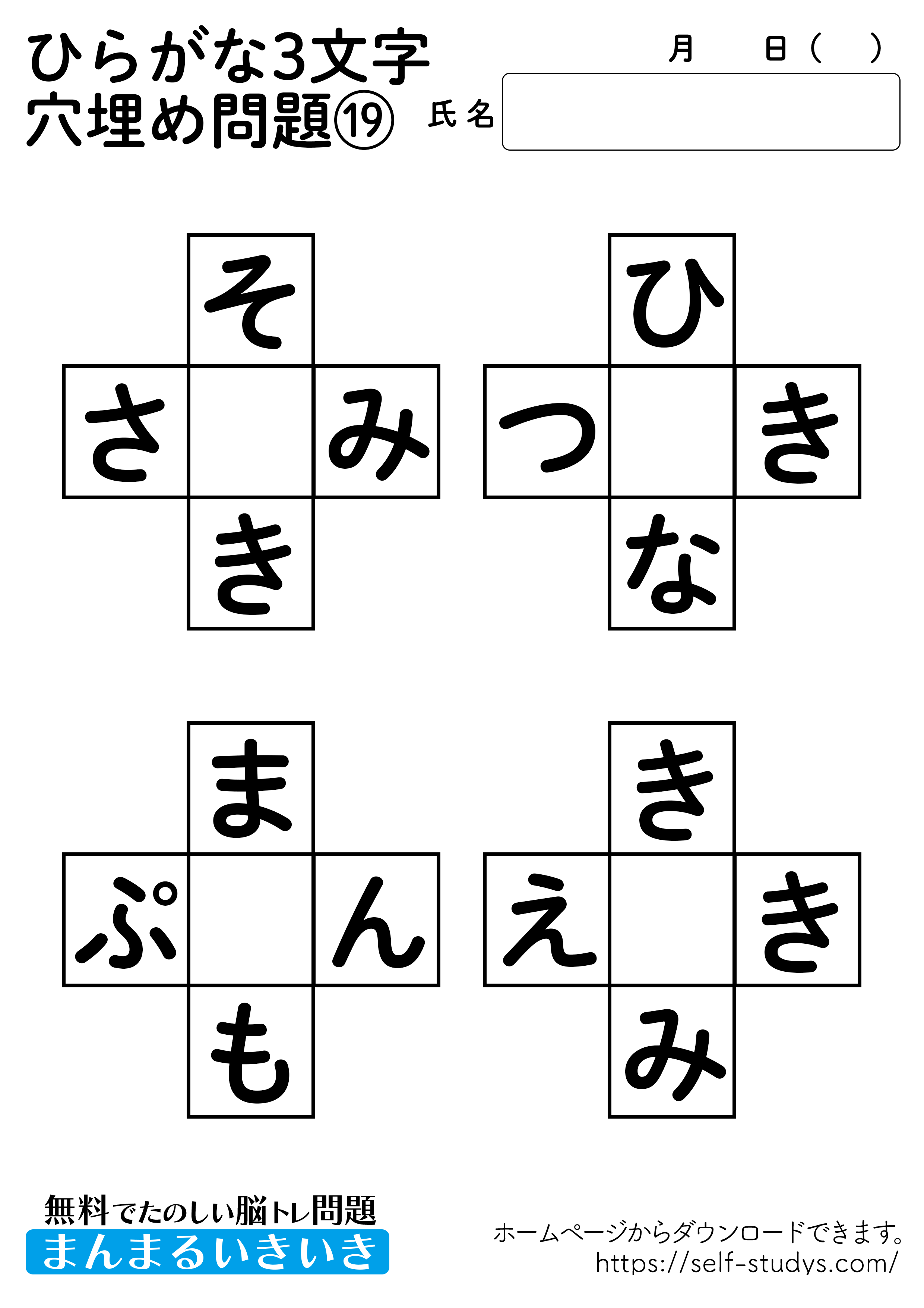 ひらがな穴埋め問題プリント19 2022.07.11 2022.07.05 ひらがな穴埋め問題プリント19問題はすべて無料で使えます。下記の画像、もしくは、【問題ダウンロード】をクリックして印刷してご利用ください。 問題ダウンロード答えダウンロード 意外と出てこないひらがなの問題。あれもこれもとたくさんの単語を頭に浮かべるので、思考力が向上し脳の活性化につながります。いつまでも健康でいられるお手伝いが出来たら幸せです。