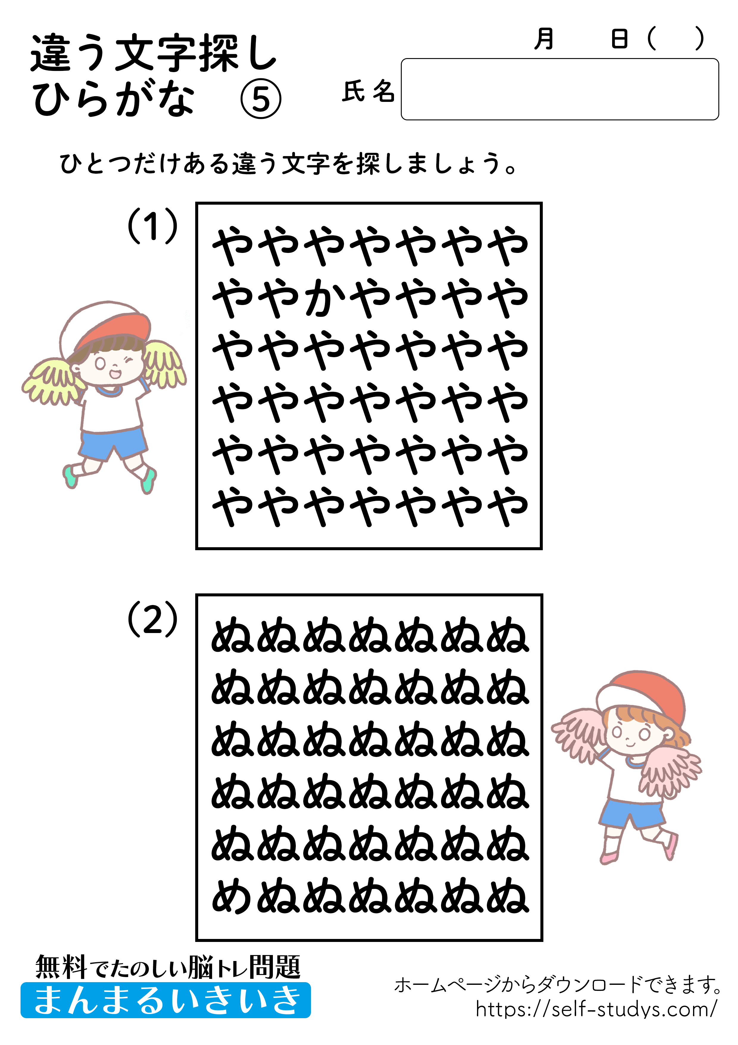 違う文字探しひらがな5 2022.07.11 2022.07.06 違う文字探しひらがな5問題はすべて無料で使えます。下記の画像、もしくは、【問題ダウンロード】をクリックして印刷してご利用ください。 問題ダウンロード答えダウンロード 動体視力・観察眼を鍛えるプリントです。いつまでも健康でいられるお手伝いが出来たら幸せです。