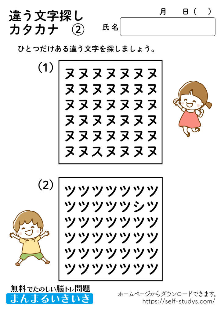 違う文字探しカタカナ2 2022.07.11 2022.07.08 違う文字探しカタカナ2問題はすべて無料で使えます。下記の画像、もしくは、【問題ダウンロード】をクリックして印刷してご利用ください。 問題ダウンロード答えダウンロード 動体視力・観察眼を鍛えるプリントです。いつまでも健康でいられるお手伝いが出来たら幸せです。