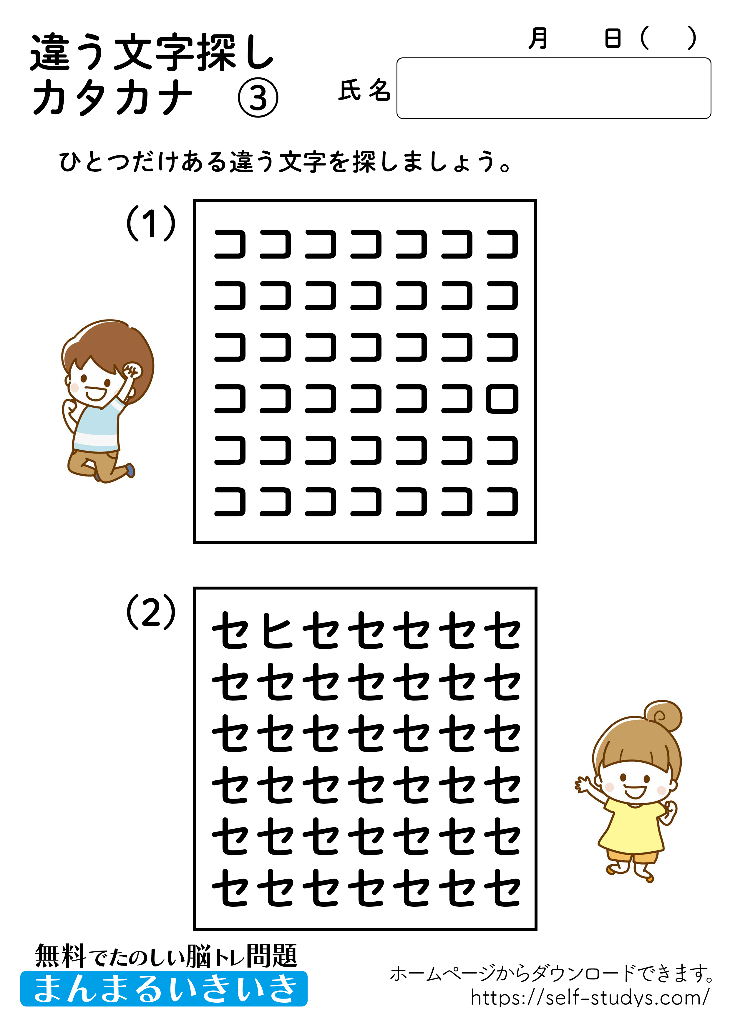 違う文字探しカタカナ3 2022.07.11 2022.07.08 違う文字探しカタカナ3問題はすべて無料で使えます。下記の画像、もしくは、【問題ダウンロード】をクリックして印刷してご利用ください。 問題ダウンロード答えダウンロード 動体視力・観察眼を鍛えるプリントです。いつまでも健康でいられるお手伝いが出来たら幸せです。