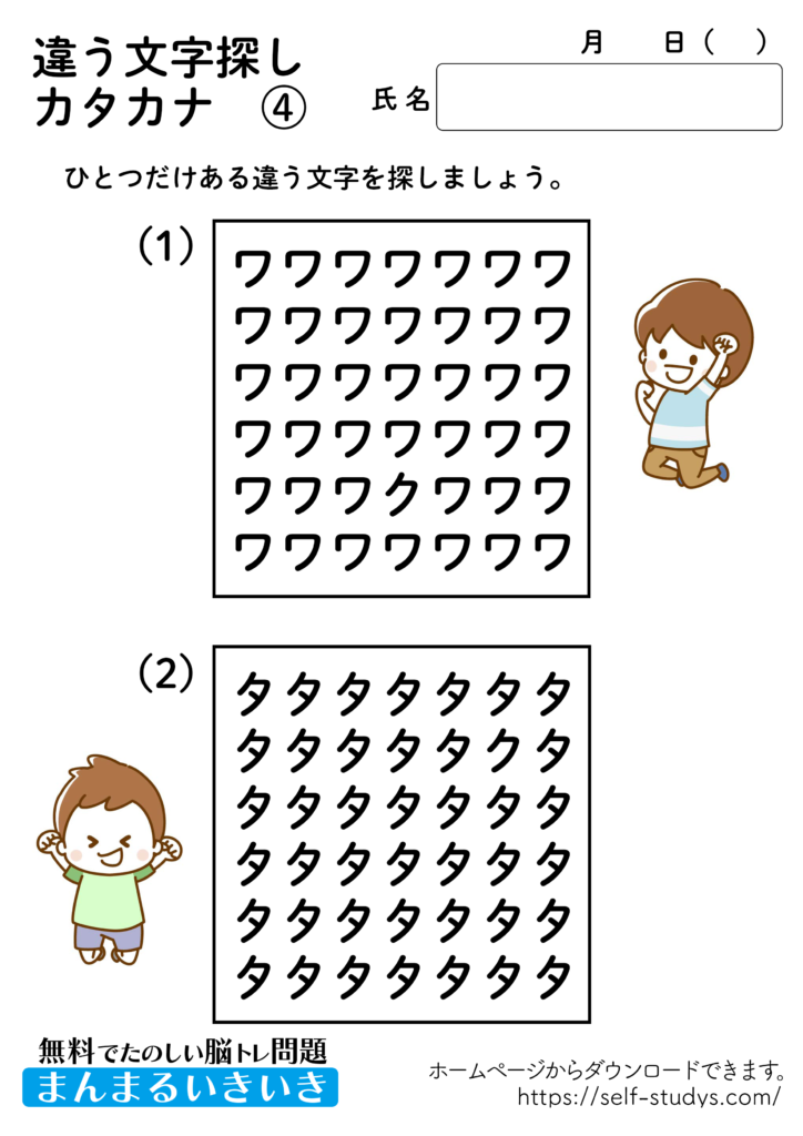 違う文字探しカタカナ4 2022.07.11 2022.07.08 違う文字探しカタカナ4問題はすべて無料で使えます。下記の画像、もしくは、【問題ダウンロード】をクリックして印刷してご利用ください。 問題ダウンロード答えダウンロード 動体視力・観察眼を鍛えるプリントです。いつまでも健康でいられるお手伝いが出来たら幸せです。