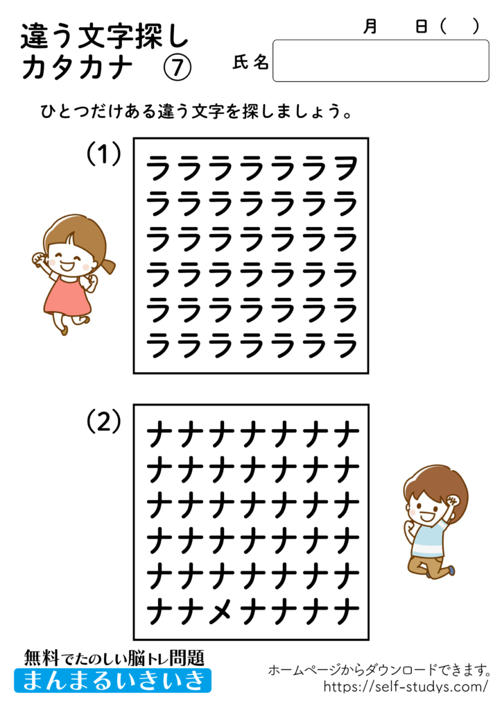 違う文字探しカタカナ7 2022.07.11 2022.07.08 違う文字探しカタカナ7問題はすべて無料で使えます。下記の画像、もしくは、【問題ダウンロード】をクリックして印刷してご利用ください。 問題ダウンロード答えダウンロード 動体視力・観察眼を鍛えるプリントです。いつまでも健康でいられるお手伝いが出来たら幸せです。